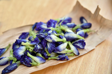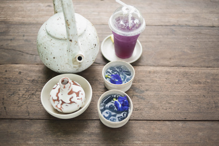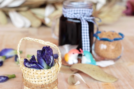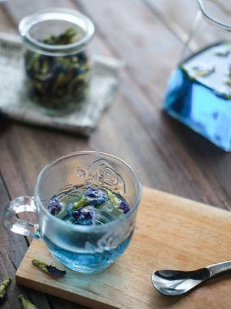 Butterfly pea flower herbal and dry butterfly pea flower on wooden table Thai herb juice and refreshment cold drink.