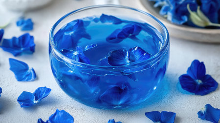 A stunning clear bowl filled with vibrant blue floral tea, surrounded by delicate blue petals, creating a calming and refreshing ambiance, perfect for relaxation.
