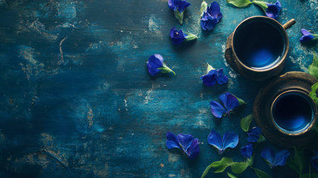 Two blue tea cups on a textured wooden table, surrounded by vibrant flower petals, create a serene and artistic setting for relaxation and wellness.