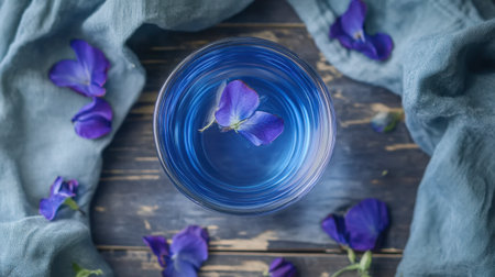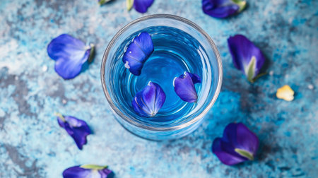 A captivating blue drink adorned with delicate flower petals sits on a textured surface, creating a serene and refreshing visual experience perfect for various creative uses.