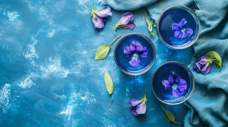 Beautiful blue drinks adorned with delicate edible flowers create an eye-catching arrangement. This photo captures elegance and refreshment, perfect for promoting wellness and style.