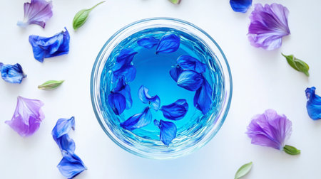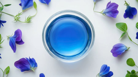 A serene image featuring a round bowl filled with blue liquid, surrounded by vibrant blue petals and green leaves. Perfect for themes of nature, health, and tranquility.