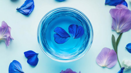 A vibrant blue beverage with delicate purple flower petals floats at the surface, surrounded by scattered petals on a light background, creating a serene, artistic atmosphere.