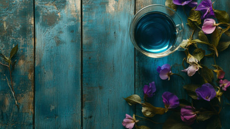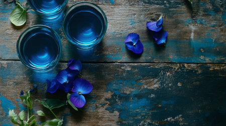 Capture the essence of relaxation with vibrant blue drinks adorned with edible flowers, set against a rustic wooden background that enhances the natural beauty.