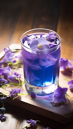 A visually stunning blue beverage adorned with delicate edible flowers, presenting a perfect blend of aesthetics and refreshment, ideal for summer gatherings.
