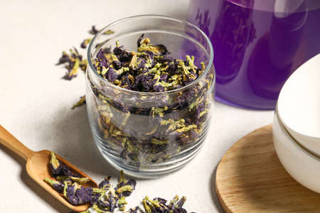 Glass jar and scoop with dried butterfly pea flowers on light background