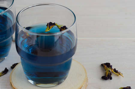 Glass of Butterfly pea or blue pea flower drink on white wooden table