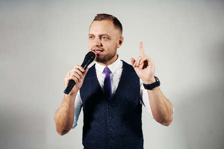The entertainer. Young elegant talking man holding microphone, Isolated on grey background