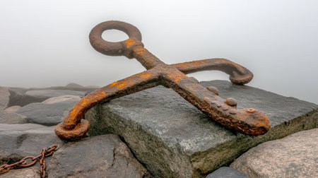 Rusty Anchor on Granite Rocks Foggy Day Coastal Scene Nautical sea old ship grey iron ocean beach