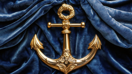A beautiful golden anchor is prominently displayed against a rich blue velvet backdrop, making it an ideal piece for nautical-themed decor and photography.