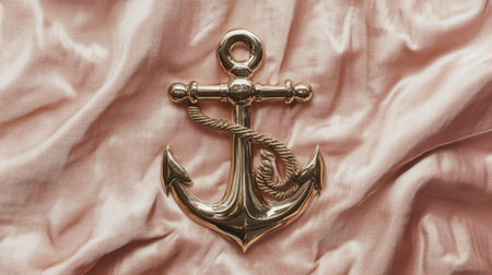 An elegant golden anchor rests gracefully on soft pink satin fabric, showcasing a luxurious and stylish aesthetic for maritime-themed designs.