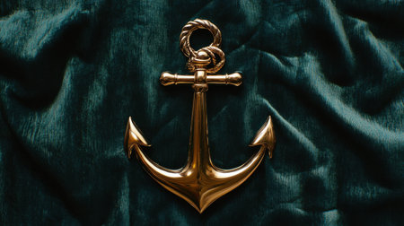 This captivating image showcases an elegant gold anchor positioned on a rich dark velvet background, perfect for maritime-themed projects or designs.