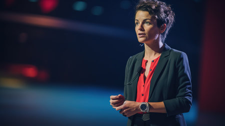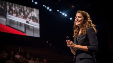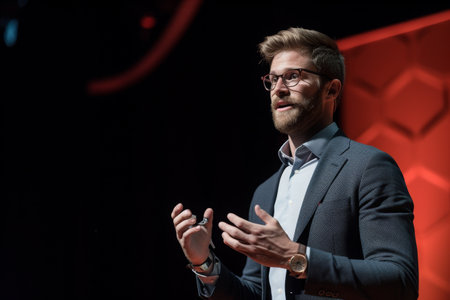 A man stands confidently on a stage, his hands casually tucked in his pockets, Man in professional business attire giving a TED talk on stage, AI Generated