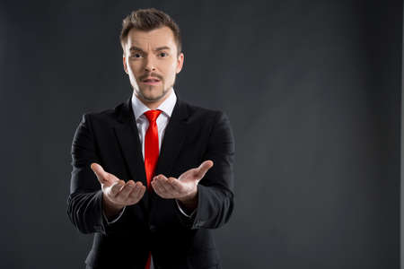 Businessman. Frustrated young men stretching out his hands while standing isolated on black
