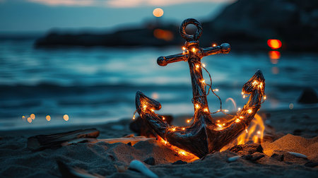 A captivating anchor rests in golden sand surrounded by warm glowing lights, creating a tranquil beach scene that evokes relaxation and summer vibes.