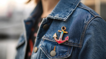 A close-up of a colorful anchor brooch attached to a denim jacket, showcasing a trendy accessory that enhances casual style and personal expression.