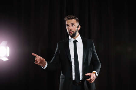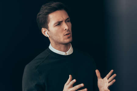 Serious young handsome man have a conversation with colleagues during meeting on black background, with wireless earphones. Caucasian businessman using wireless headphones in business conference.