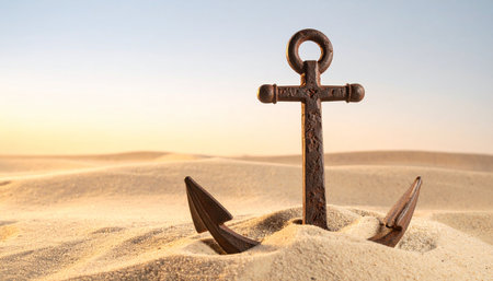 An old, weathered anchor rests half-buried in the shifting sands of a vast desert.