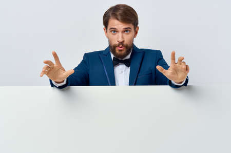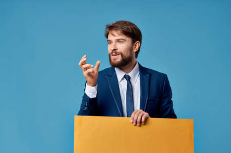 emotional man advertising yellow banner presentation blue background
