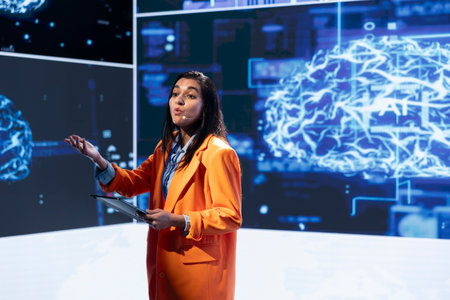 Speaker talking with world leading technology specialists and innovators meeting at event to do deep dive into artificial intelligence technology. Professional showcasing latest innovations in AI