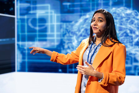 Exited asian woman motivational speaker on stage. Diversity, Success, Leadership, STEM concept. Generative AI.