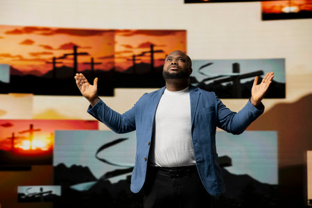 Black believer embraces the presence of God with eyes closed in calm reflection, praying to evoke worshipping, gratitude and a sacred connection to peace and inner strength. Christianity.