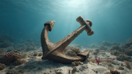 That the image is generated using AI. Rusted anchor resting on seabed amidst aquatic tranquility and particulate suspense.