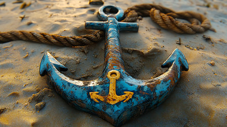 Generative AI Image of Ancient Anchor and Nautical Rope with Beach Sand Background