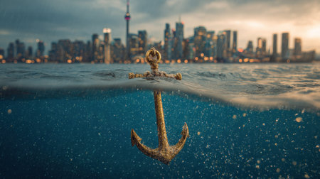 Stunning image of an anchor submerged in clear water, with a mesmerizing city skyline glowing in the background at dusk.