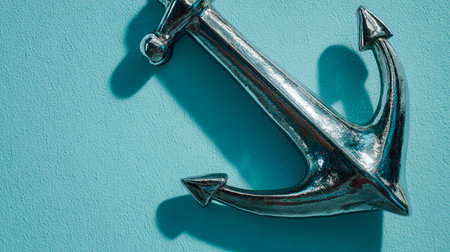 A gleaming metallic anchor outlined by a crisp shadow against a vibrant, textured blue surface, evoking maritime resilience and timeless nautical elegance.