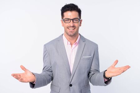 Happy young handsome businessman with eyeglasses smiling