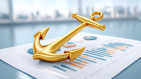 Gold anchor rests on financial report with stable growth charts and calm optimistic tone