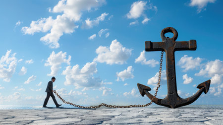 Businessman struggles forward as chained anchor drags behind, symbolizing career burdens