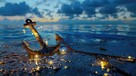 A beautiful scene featuring a glittering anchor resting on the shoreline at sunset, reflecting in the water with sparkling sand, evoking tranquility and adventure.