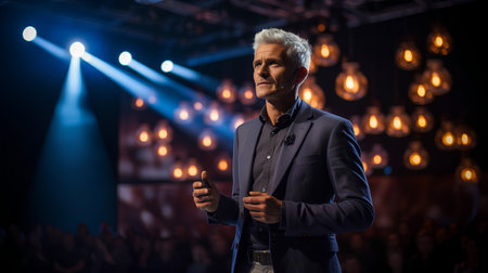 Man motivational speaker on stage, talking about success and leadership. Generative AI.