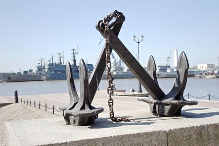 Metal anchor near river on sunny day