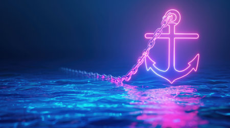 A captivating neon anchor design shines in vibrant blue and pink tones above a tranquil water surface, creating an atmospheric and modern visual.