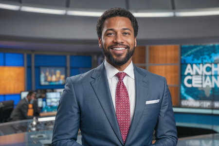 Anchorman reporting tv live news evening program. Presenter talking television