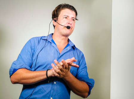 young attractive and successful man giving motivation coaching speech talking through headset gesturing confident at corporate business success seminar