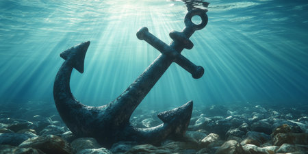 Sunken Anchor Lies on the Ocean Floor with Beams of Dappled Sunlight Creating an Ethereal Mood