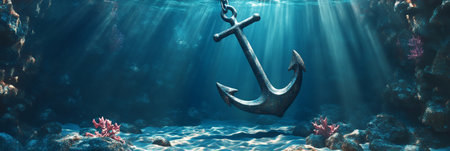 A stunning underwater scene showcasing a weathered anchor lying on the sandy sea floor, surrounded by vibrant coral and illuminated by soft sunlight, creating a serene atmosphere.