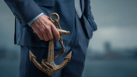 Businessman holding an anchor in his hand. Close-up.