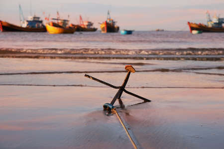An anchor rests on a sandy beach as gentle waves lap the shore at sunset. The image displays warm colors with soft sunlight illuminating the water and sand. Several sailing vessels are visible on the horizon, creating a peaceful atmosphere suitable for various commercial projects.