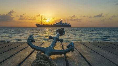 Photo of an anchor with a rope on a wooden dock, with a ship in the background at sunset. --chaos 30 --ar 16:9 --v 6.1 Job ID: f4b62aee-1127-4e7b-8b48-992b3d278262