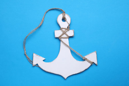 A simple wooden anchor pendant hangs from a sturdy rope against a weathered blue wooden background. This image evokes feelings of stability, security, hope, and a connection to the sea and adventure.