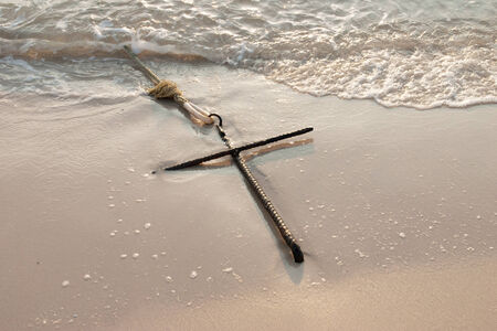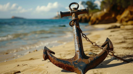 A weathered anchor rests on a sandy beach, bathed in warm sunlight with gentle ocean waves in the background, conveying a sense of tranquility and adventure.