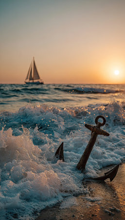 An image captures an anchor partially submerged in ocean water, with waves crashing around it. A sailboat is visible in the distance, set against a warm sunset sky. The scene exhibits natural lighting and a realistic style. Suitable for various applications, including commercial and editorial uses.