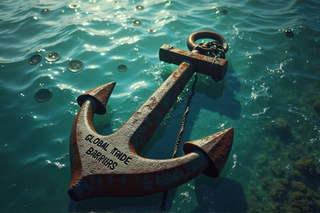 That the image is generated using AI. Rusted anchor with global trade barriers text in ocean waters.