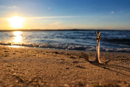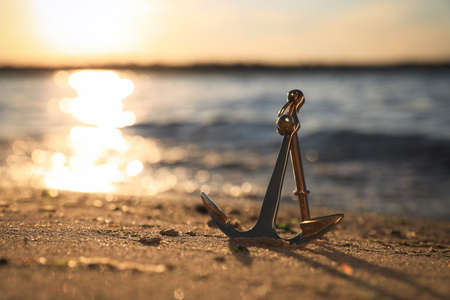 This captivating image features a close-up of a metal anchor resting on a sandy beach, illuminated by soft sunset light with a sparkling ocean backdrop.
