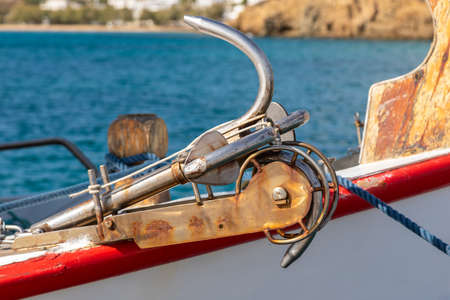 Anchor pulled out on board the cutter moored in the port. Piso Livadi, Paros Island, Greece.